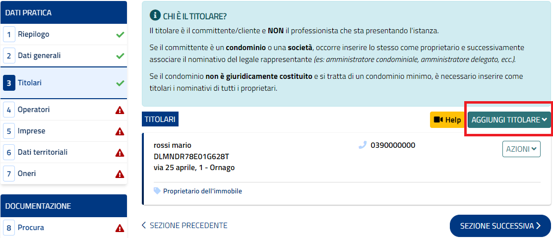 - Cliccare sul bottone AGGIUNGI TITOLARE